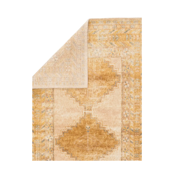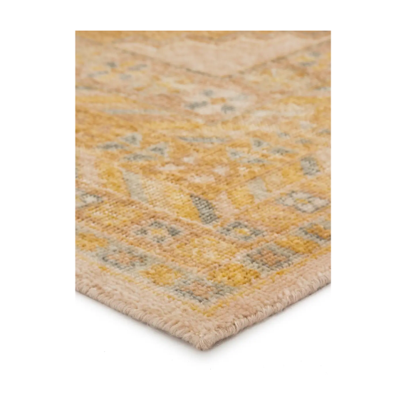 This rug is from an assortment of beautifully colored hand-knotted designs. It showcases a vintage-inspired bordered medallion design in on-trend golden tones, stunningly distressed for texture and antique vibes. Hand knotted of high-quality wool, this artisan-made rug makes a bold and vivid statement in any stylish interior.