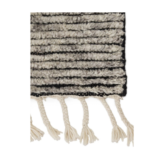Inspired by textiles from the Tullu region in Morocco, this plush area rug showcases a heathered solid design in neutral shades of gray and white. This high-piled accent lends warmth and comfort to any space with durable wool hand-knotted onto a cotton foundation. Braided fringe trims the edges for a touch of boho charm.