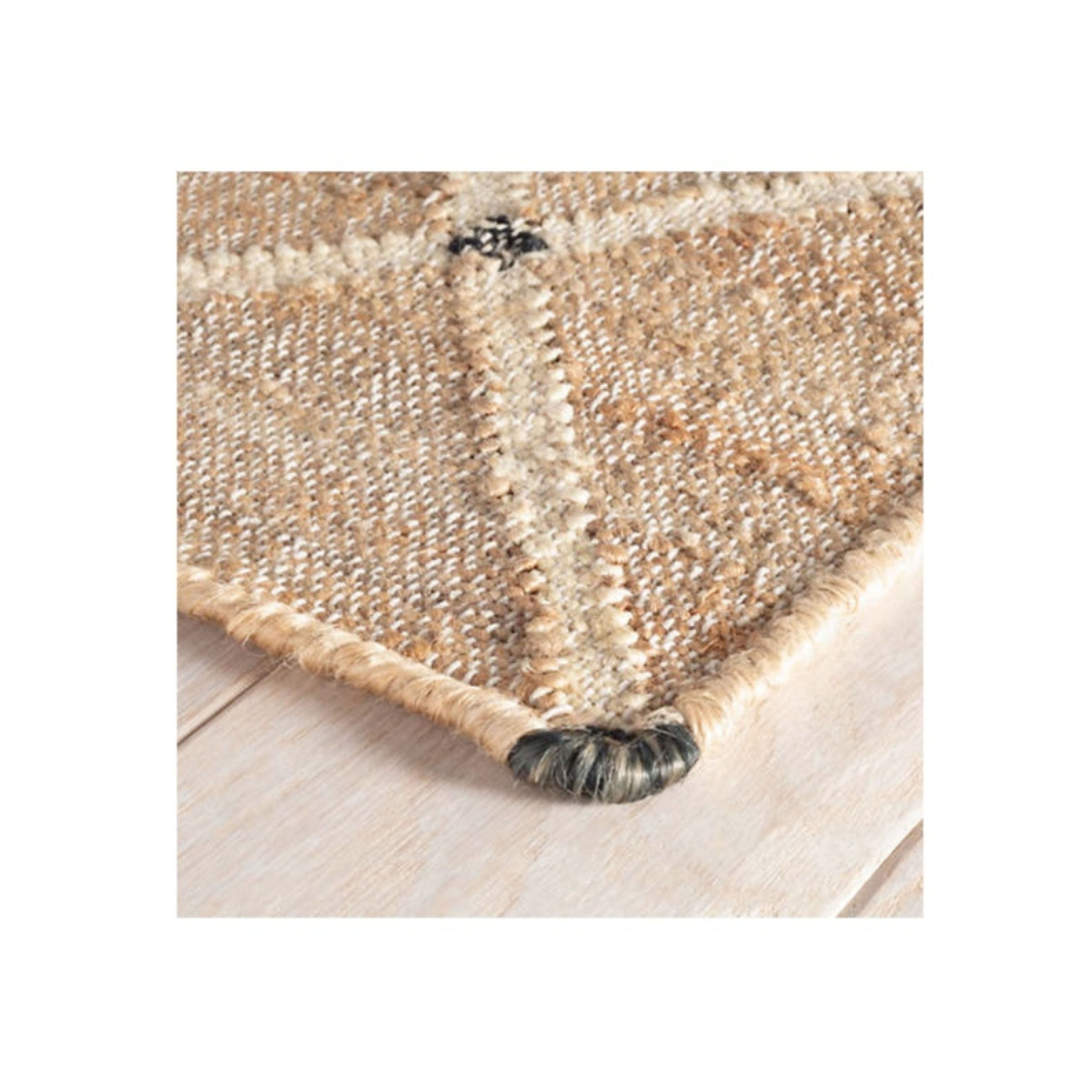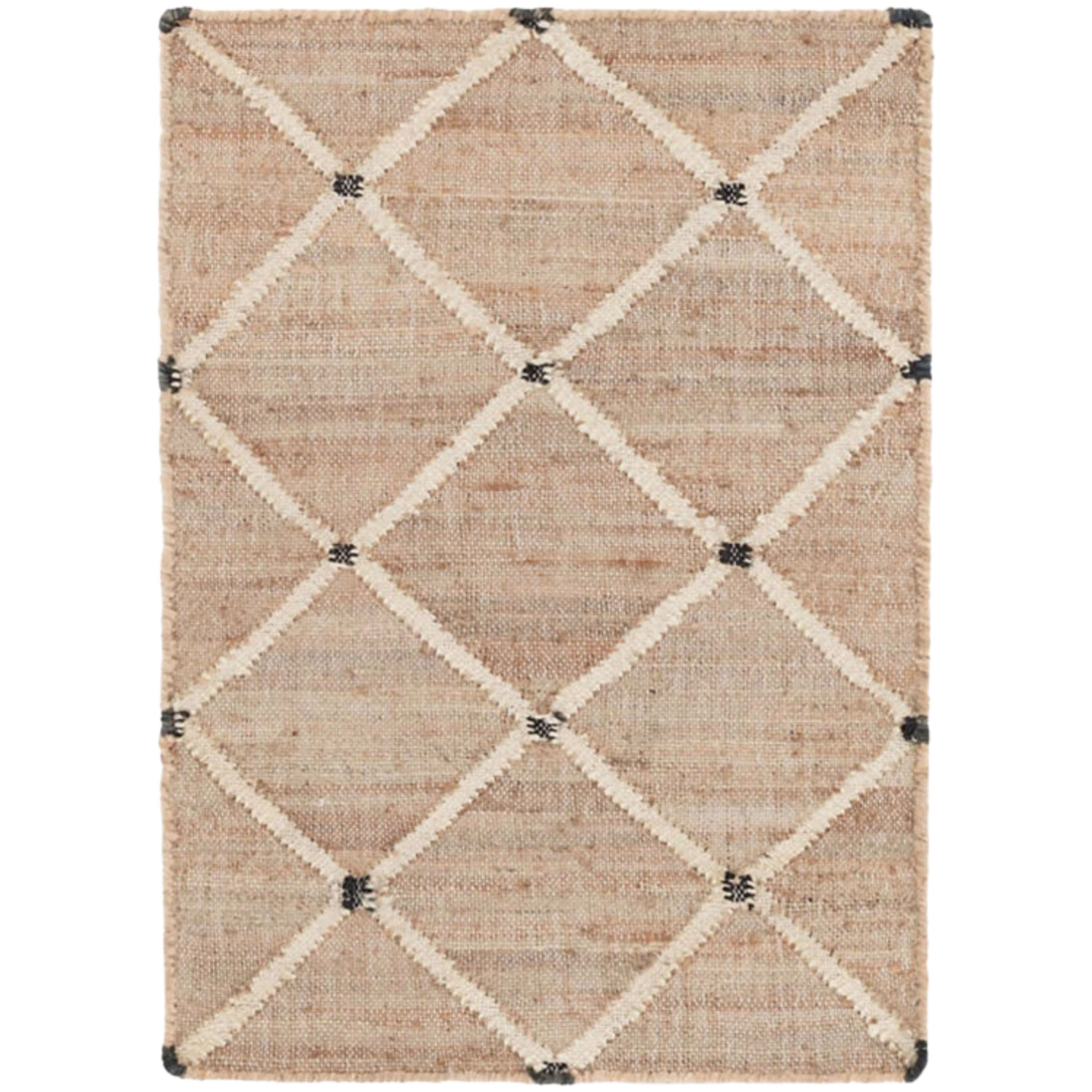 A large ivory latticework pattern emerges from the relaxed natural jute kilim weave foundation with a punctuating charcoal dot at the interstices. This simple flatwoven jute design offers beauty and appeal on a scale that makes it modern and timeless. Eco-friendly, ultra durable and great for any indoor room