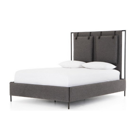 Safari styling gets a modern reboot. Linen-blend upholstery lays a texture-rich base for a forward-thinking bedroom look. Black leather straps secure decorative headboard pillows, suspended for eye-catching effect. Box spring required.