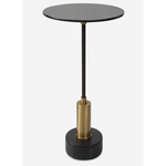 Elegant and sophisticated, this round accent table features a brushed brass and satin black iron base with black marble details and a black glass top.