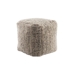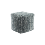 The Vagabond pouf collection features rich textural and global style. The handwoven Sherwood pouf boasts a plush wool construction in a heathered blue, ivory, and gray colorway.