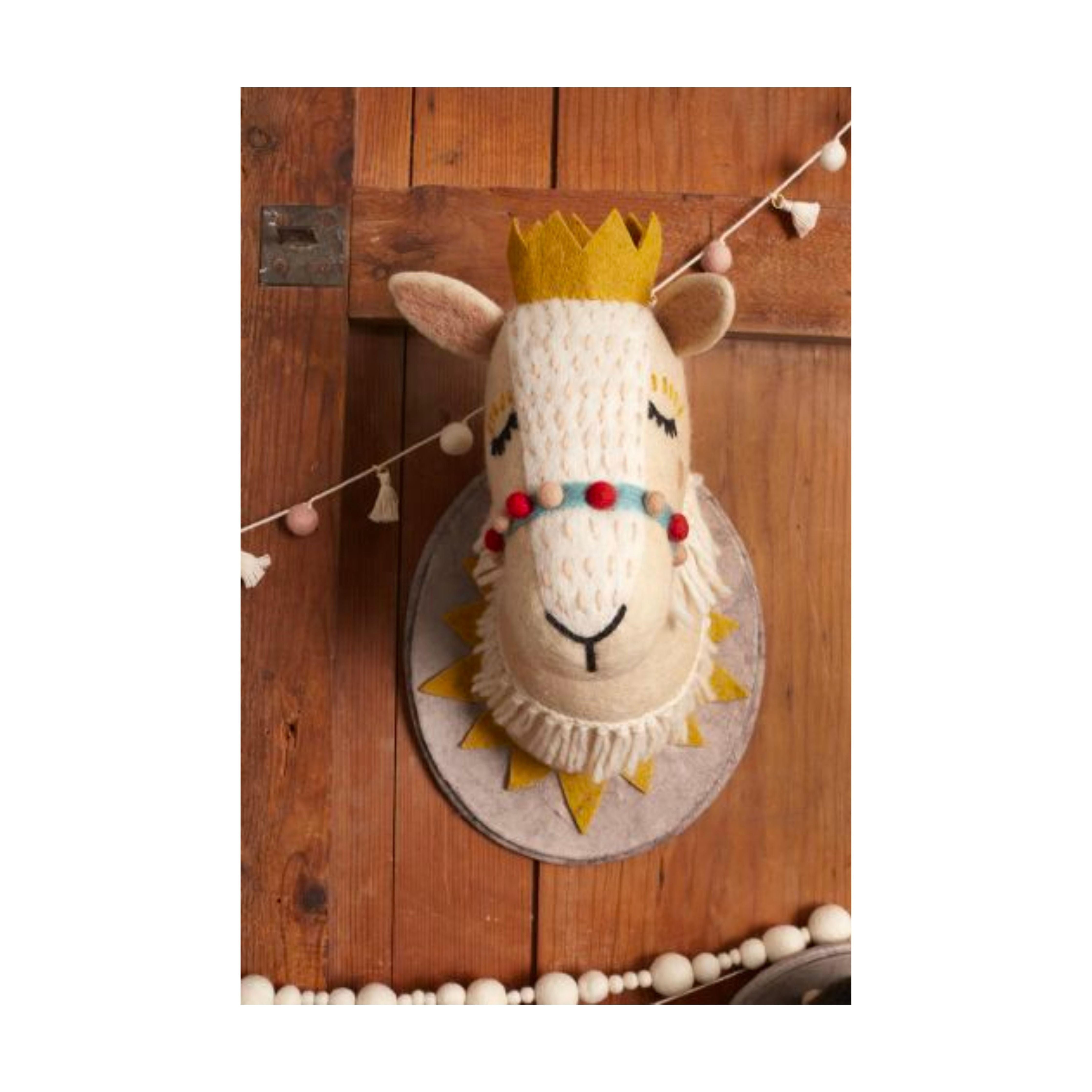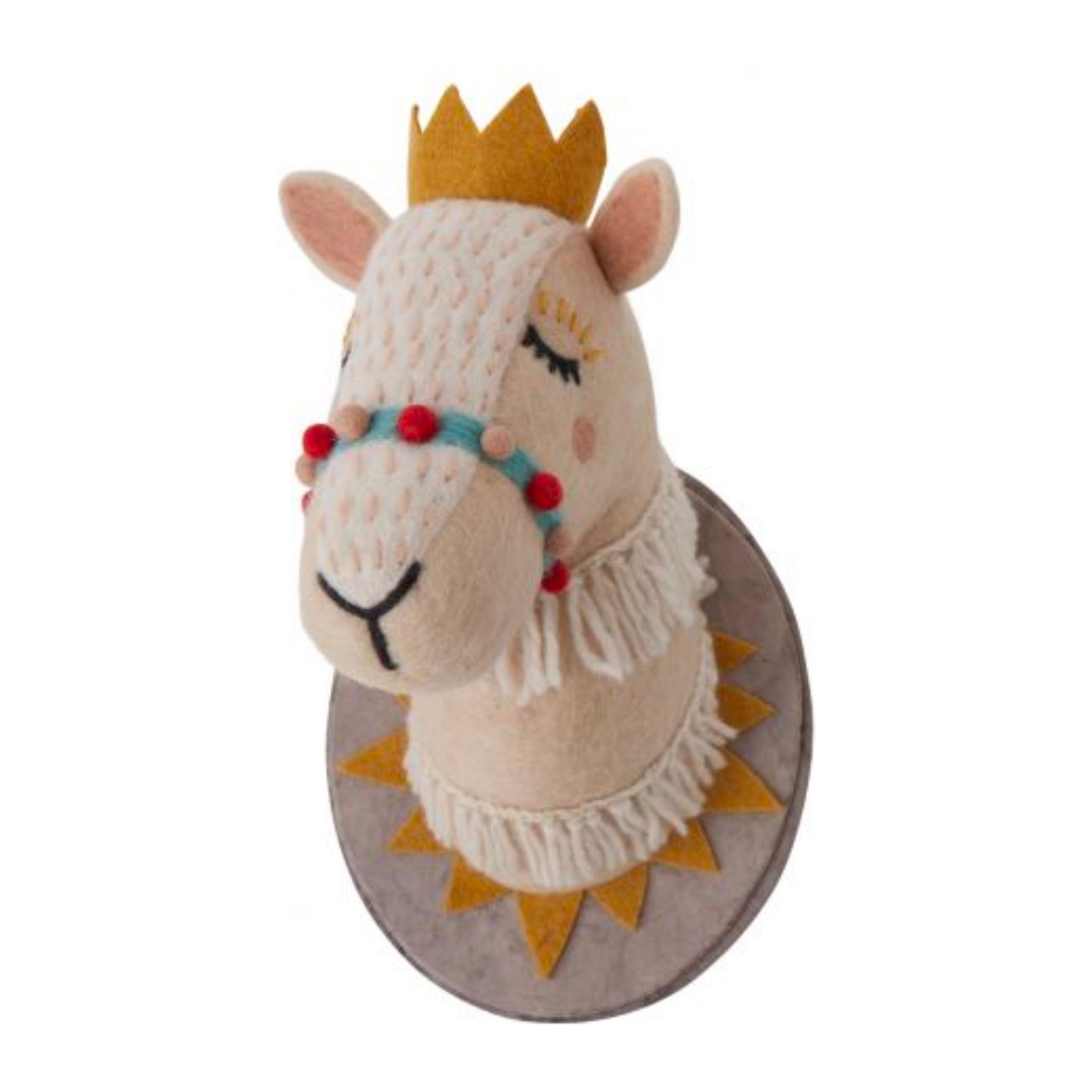 Bring a sweet cozy friend into your home with Buddy Wall Mount, a felt animal bust made in Nepal. The camel mount wears a golden felt crown and has a pompom bridle and tassels.