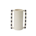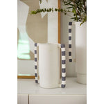 Create an easygoing, neutral home decor moment on styled shelves, a console, or coffee table centerpiece with the stoneware footed cylinder Milos Vase. With its white painted body & 2 black & white patterned, squared off handles, this unique vessel can be both a sculptural accent piece or vase for dried florals. The Milos is not fully watertight so we recommend styling with preserved stems, or as a decorative vessel. The slightly rough surface texture is created from sand in the natural clay and adds to its handmade feel.